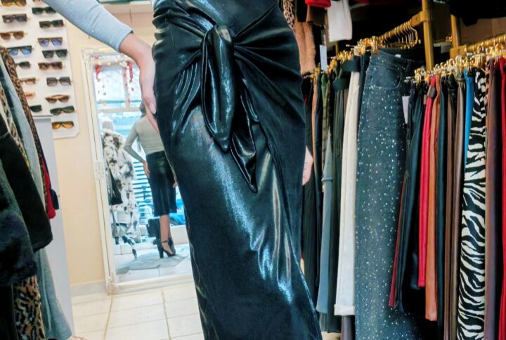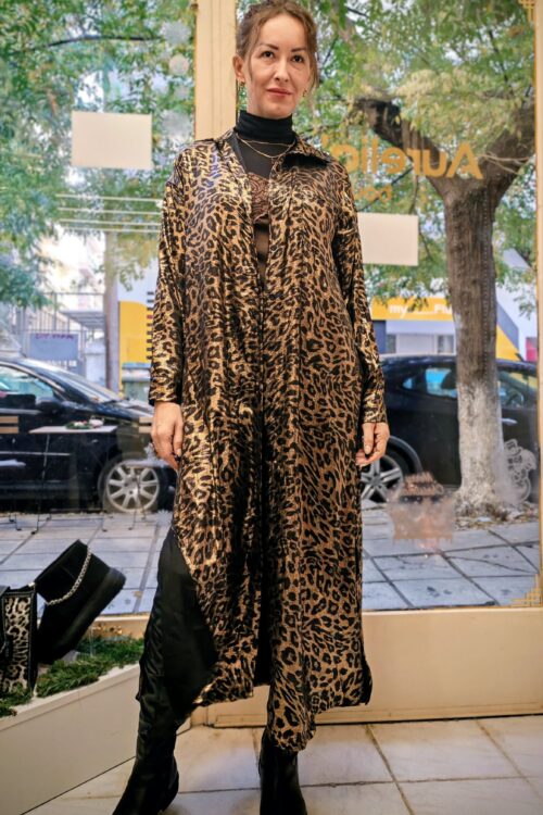 Μινι φορεμα λεοπαρ με ανοιχτη πλατι και εντυπψσιακα μακρια μανικια